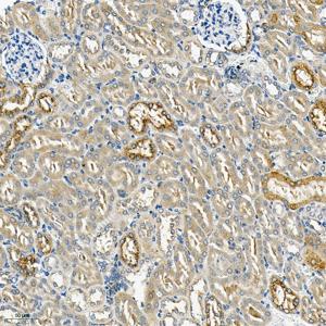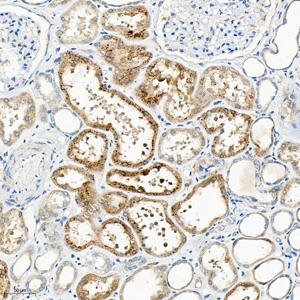 | IHC检测Cathepsin L/MEP蛋白(货号 GB115577). 样品: 小鼠肾, 4%多聚甲醛 (货号G1101) 固定12-24小时. 抗原修复: Tris-EDTA抗原修复液(pH 9.0) (G1203), 98℃, 20分钟. —抗: 1: 150稀释, 4℃ 孵育过夜. 二抗: HRP标记山羊抗兔IgG (H+L) (货号GB23303), 1: 200稀释, 室温孵育1小时. |