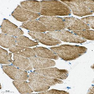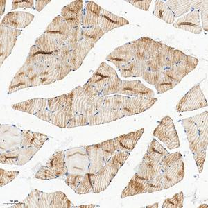 | IHC检测Cathepsin L/MEP蛋白(货号 GB115577). 样品: 小鼠骨骼肌, 4%多聚甲醛 (货号G1101) 固定12-24小时. 抗原修复: Tris-EDTA抗原修复液(pH 9.0) (G1203), 98℃, 20分钟. —抗: 1: 150稀释, 4℃ 孵育过夜. 二抗: HRP标记山羊抗兔IgG (H+L) (货号GB23303), 1: 200稀释, 室温孵育1小时. |