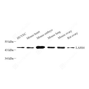 WB检测LASS4蛋白(货号 GB112934). 样品: 经RIPA裂解液(货号G2002)处理的蛋白质. 封闭: 封闭: 3%脱脂牛奶(货号GC310001)溶于TBST溶液, 室温孵育1小时. —抗: 1: 1000稀释, 4℃ 孵育过夜. 二抗: HRP标记山羊抗兔IgG (H+L) (货号GB23303), 1: 5000稀释, 室温孵育1小时. |