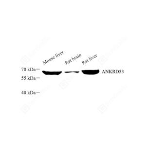 WB检测ANKRD53蛋白(货号 GB115417). 样品: 经RIPA裂解液(货号G2002)处理的蛋白质. 封闭: 封闭: 3%脱脂牛奶(货号GC310001)溶于TBST溶液, 室温孵育1小时. —抗: 1: 3000稀释, 4℃ 孵育过夜. 二抗: HRP标记山羊抗兔IgG (H+L) (货号GB23303), 1: 5000稀释, 室温孵育1小时. |