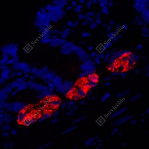 IF检测DEFA6蛋白(货号 GB114861)(红色). 样品: 大鼠小肠, 4%多聚甲醛 (货号G1101) 固定12-24小时. 抗原修复: Tris-EDTA抗原修复液(pH 9.0) (G1203), 98℃, 20分钟. 封闭: 3% BSA(货号GC305010)的PBS溶液, 室温孵育30分钟. —抗: 1: 4000稀释, 4℃ 孵育过夜. 二抗: Cy3标记山羊抗兔IgG (H+L) (货号GB21303), 1: 300稀释, 室温孵育1小时. |