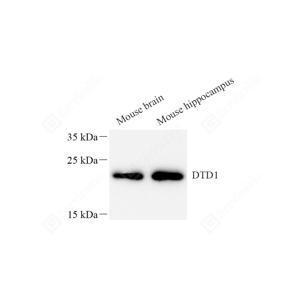 | WB检测DTD1蛋白(货号 GB113612). 样品: 经RIPA裂解液(货号G2002)处理的蛋白质. 封闭: 封闭: 3%脱脂牛奶(货号GC310001)溶于TBST溶液, 室温孵育1小时. —抗: 1: 1000稀释, 4℃ 孵育过夜. 二抗: HRP标记山羊抗兔IgG (H+L) (货号GB23303), 1: 5000稀释, 室温孵育1小时. |