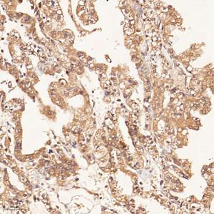 IHC检测DUS4L蛋白(货号 GB115221). 样品: 人肾癌, 4%多聚甲醛 (货号G1101) 固定12-24小时. 抗原修复: Tris-EDTA抗原修复液(pH 9.0) (G1203), 98℃, 20分钟. —抗: 1: 700稀释, 4℃ 孵育过夜. 二抗: HRP标记山羊抗兔IgG (H+L) (货号GB23303), 1: 200稀释, 室温孵育1小时. |