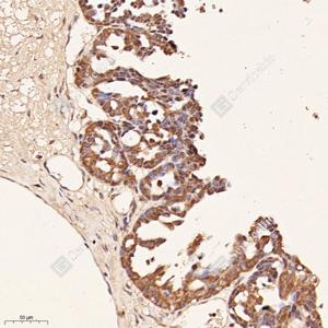 IHC检测DUS4L蛋白(货号 GB115221). 样品: 人卵巢瘤, 4%多聚甲醛 (货号G1101) 固定12-24小时. 抗原修复: Tris-EDTA抗原修复液(pH 9.0) (G1203), 98℃, 20分钟. —抗: 1: 700稀释, 4℃ 孵育过夜. 二抗: HRP标记山羊抗兔IgG (H+L) (货号GB23303), 1: 200稀释, 室温孵育1小时. |