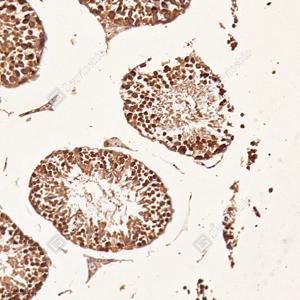 IHC检测DUS4L蛋白(货号 GB115221). 样品: 小鼠睾丸, 4%多聚甲醛 (货号G1101) 固定12-24小时. 抗原修复: Tris-EDTA抗原修复液(pH 9.0) (G1203), 98℃, 20分钟. —抗: 1: 700稀释, 4℃ 孵育过夜. 二抗: HRP标记山羊抗兔IgG (H+L) (货号GB23303), 1: 200稀释, 室温孵育1小时. |