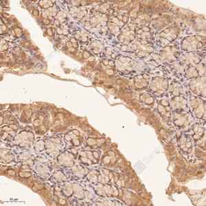 IHC检测DUS4L蛋白(货号 GB115221). 样品: 小鼠结肠, 4%多聚甲醛 (货号G1101) 固定12-24小时. 抗原修复: Tris-EDTA抗原修复液(pH 9.0) (G1203), 98℃, 20分钟. —抗: 1: 700稀释, 4℃ 孵育过夜. 二抗: HRP标记山羊抗兔IgG (H+L) (货号GB23303), 1: 200稀释, 室温孵育1小时. |