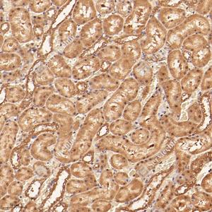 IHC检测DUS4L蛋白(货号 GB115221). 样品: 大鼠肾, 4%多聚甲醛 (货号G1101) 固定12-24小时. 抗原修复: Tris-EDTA抗原修复液(pH 9.0) (G1203), 98℃, 20分钟. —抗: 1: 700稀释, 4℃ 孵育过夜. 二抗: HRP标记山羊抗兔IgG (H+L) (货号GB23303), 1: 200稀释, 室温孵育1小时. |