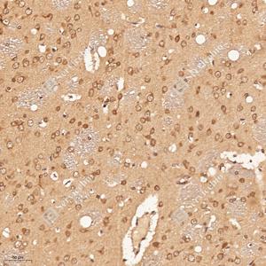 IHC检测DUS4L蛋白(货号 GB115221). 样品: 大鼠脑, 4%多聚甲醛 (货号G1101) 固定12-24小时. 抗原修复: Tris-EDTA抗原修复液(pH 9.0) (G1203), 98℃, 20分钟. —抗: 1: 700稀释, 4℃ 孵育过夜. 二抗: HRP标记山羊抗兔IgG (H+L) (货号GB23303), 1: 200稀释, 室温孵育1小时. |