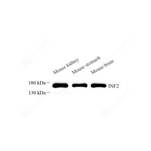 WB检测INF2蛋白(货号 GB115034). 样品: 经RIPA裂解液(货号G2002)处理的蛋白质. 封闭: 3%脱脂牛奶(货号GC310001)溶于TBST溶液, 室温孵育1小时. —抗: 1: 1000稀释, 4℃ 孵育过夜. 二抗: HRP标记山羊抗兔IgG (H+L) (货号GB23303), 1: 5000稀释, 室温孵育1小时. |