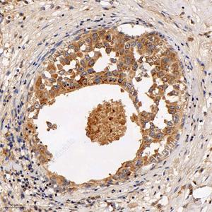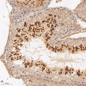 IHC检测INF2蛋白(货号 GB115034). 样品: 小鼠睾丸, 4%多聚甲醛 (货号G1101) 固定12-24小时. 抗原修复: Tris-EDTA抗原修复液(pH 9.0) (G1203), 98℃, 20分钟. —抗: 1: 600稀释, 4℃ 孵育过夜. 二抗: HRP标记山羊抗兔IgG (H+L) (货号GB23303), 1: 200稀释, 室温孵育1小时. |