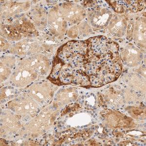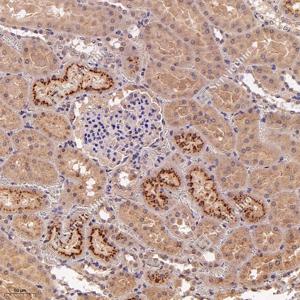 IHC检测INF2蛋白(货号 GB115034). 样品: 人肾, 4%多聚甲醛 (货号G1101) 固定12-24小时. 抗原修复: Tris-EDTA抗原修复液(pH 9.0) (G1203), 98℃, 20分钟. —抗: 1: 600稀释, 4℃ 孵育过夜. 二抗: HRP标记山羊抗兔IgG (H+L) (货号GB23303), 1: 200稀释, 室温孵育1小时. |