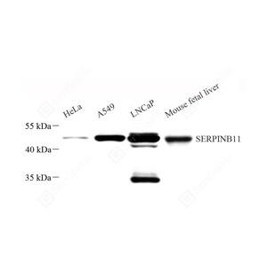 WB检测SERPINB11蛋白(货号 GB115340). 样品: 经RIPA裂解液(货号G2002)处理的蛋白质. 封闭: 封闭: 3%脱脂牛奶(货号GC310001)溶于TBST溶液, 室温孵育1小时. —抗: 1: 1000稀释, 4℃ 孵育过夜. 二抗: HRP标记山羊抗兔IgG (H+L) (货号GB23303), 1: 5000稀释, 室温孵育1小时. |