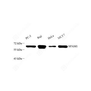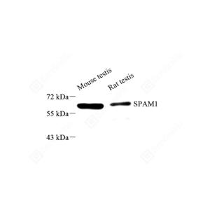 WB检测SPAM1蛋白(货号 GB113394). 样品: 经RIPA裂解液(货号G2002)处理的蛋白质. 封闭: 封闭: 3%脱脂牛奶(货号GC310001)溶于TBST溶液, 室温孵育1小时. —抗: 1: 600稀释, 4℃ 孵育过夜. 二抗: HRP标记山羊抗兔IgG (H+L) (货号GB23303), 1: 5000稀释, 室温孵育1小时. |