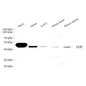 WB检测TFPI蛋白(货号 GB115492). 样品: 经RIPA裂解液(货号G2002)处理的蛋白质. 封闭: 封闭: 3%脱脂牛奶(货号GC310001)溶于TBST溶液, 室温孵育1小时. —抗: 1: 300稀释, 4℃ 孵育过夜. 二抗: HRP标记山羊抗兔IgG (H+L) (货号GB23303), 1: 5000稀释, 室温孵育1小时. |