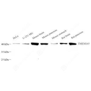 WB检测TMEM165蛋白(货号 GB114328). 样品: 经RIPA裂解液(货号G2002)处理的蛋白质. 封闭: 封闭: 3%脱脂牛奶(货号GC310001)溶于TBST溶液, 室温孵育1小时. —抗: 1: 1000稀释, 4℃ 孵育过夜. 二抗: HRP标记山羊抗兔IgG (H+L) (货号GB23303), 1: 5000稀释, 室温孵育1小时. |