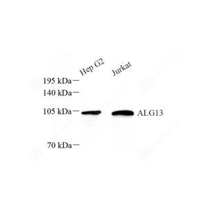 WB检测ALG13蛋白(货号 GB115682). 样品: 经RIPA裂解液(货号G2002)处理的蛋白质. 封闭: 3%脱脂牛奶(货号GC310001)溶于TBST溶液, 室温孵育1小时. —抗: 1: 1000稀释, 4℃ 孵育过夜. 二抗: HRP标记山羊抗兔IgG (H+L) (货号GB23303), 1: 5000稀释, 室温孵育1小时. |