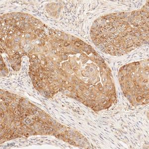 IHC检测ANKMY2蛋白(货号 GB115078). 样品: 人食管癌, 4%多聚甲醛 (货号G1101) 固定12-24小时. 抗原修复: Tris-EDTA抗原修复液(pH 9.0) (G1203), 98℃, 20分钟. —抗: 1: 600稀释, 4℃ 孵育过夜. 二抗: HRP标记山羊抗兔IgG (H+L) (货号GB23303), 1: 200稀释, 室温孵育1小时. |