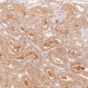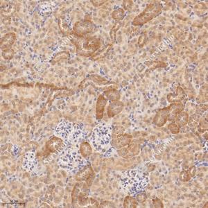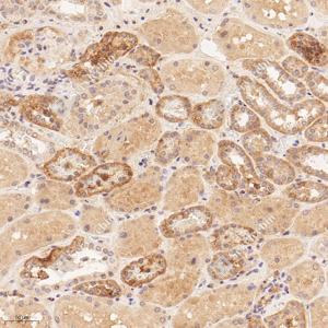 IHC检测ANKMY2蛋白(货号 GB115078). 样品: 人肾, 4%多聚甲醛 (货号G1101) 固定12-24小时. 抗原修复: Tris-EDTA抗原修复液(pH 9.0) (G1203), 98℃, 20分钟. —抗: 1: 600稀释, 4℃ 孵育过夜. 二抗: HRP标记山羊抗兔IgG (H+L) (货号GB23303), 1: 200稀释, 室温孵育1小时. |