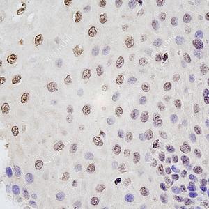 IHC检测CCDC28A蛋白(货号 GB115332). 样品: 人食管, 4%多聚甲醛 (货号G1101) 固定12-24小时. 抗原修复: Tris-EDTA抗原修复液(pH 9.0) (G1203), 98℃, 20分钟. —抗: 1: 1000稀释, 4℃ 孵育过夜. 二抗: HRP标记山羊抗兔IgG (H+L) (货号GB23303), 1: 200稀释, 室温孵育1小时. |