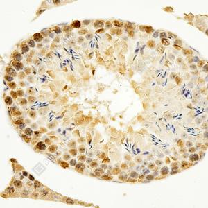 IHC检测CCDC28A蛋白(货号 GB115332). 样品: 小鼠睾丸, 4%多聚甲醛 (货号G1101) 固定12-24小时. 抗原修复: Tris-EDTA抗原修复液(pH 9.0) (G1203), 98℃, 20分钟. —抗: 1: 1000稀释, 4℃ 孵育过夜. 二抗: HRP标记山羊抗兔IgG (H+L) (货号GB23303), 1: 200稀释, 室温孵育1小时. |