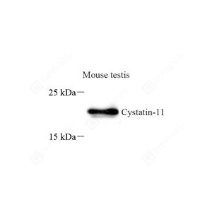 WB检测Cystatin-11蛋白(货号 GB115285). 样品: 经RIPA裂解液(货号G2002)处理的蛋白质. 封闭: 封闭: 3%脱脂牛奶(货号GC310001)溶于TBST溶液, 室温孵育1小时. —抗: 1: 1000稀释, 4℃ 孵育过夜. 二抗: HRP标记山羊抗兔IgG (H+L) (货号GB23303), 1: 5000稀释, 室温孵育1小时. |