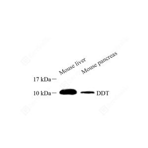 WB检测DDT蛋白(货号 GB113570). 样品: 经RIPA裂解液(货号G2002)处理的蛋白质. 封闭: 封闭: 3%脱脂牛奶(货号GC310001)溶于TBST溶液, 室温孵育1小时. —抗: 1: 1000稀释, 4℃ 孵育过夜. 二抗: HRP标记山羊抗兔IgG (H+L) (货号GB23303), 1: 5000稀释, 室温孵育1小时. |