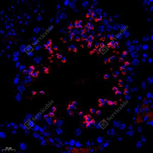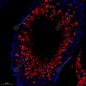 IF检测ESD蛋白(货号 GB112177)(红色). 样品: 小鼠睾丸, 4%多聚甲醛 (货号G1101) 固定12-24小时. 抗原修复: Tris-EDTA抗原修复液(pH 9.0) (G1203), 98℃, 20分钟. 封闭: 3% BSA(货号GC305010)的PBS溶液, 室温孵育30分钟. —抗: 1: 400稀释, 4℃ 孵育过夜. 二抗: Cy3标记山羊抗兔IgG (H+L) (货号GB21303), 1: 300稀释, 室温孵育1小时. |