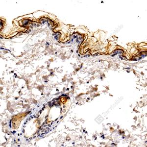 IHC检测Kallikrein 7/KLK7蛋白(货号 GB112987). 样品: 小鼠皮肤, 4%多聚甲醛 (货号G1101) 固定12-24小时. 抗原修复: 柠檬酸抗原修复液(干粉, pH 6.0) (G1201), 98℃, 20分钟. —抗: 1: 800稀释, 4℃ 孵育过夜. 二抗: HRP标记山羊抗兔IgG (H+L) (货号GB23303), 1: 200稀释, 室温孵育1小时. |