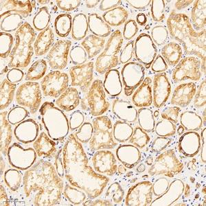 IHC检测KBTBD4蛋白(货号 GB114942). 样品: 人肾, 4%多聚甲醛 (货号G1101) 固定12-24小时. 抗原修复: Tris-EDTA抗原修复液(pH 9.0) (G1203), 98℃, 20分钟. —抗: 1: 1000稀释, 4℃ 孵育过夜. 二抗: HRP标记山羊抗兔IgG (H+L) (货号GB23303), 1: 200稀释, 室温孵育1小时. |