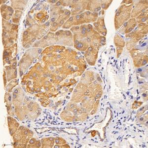 IHC检测KBTBD4蛋白(货号 GB114942). 样品: 小鼠胰腺, 4%多聚甲醛 (货号G1101) 固定12-24小时. 抗原修复: Tris-EDTA抗原修复液(pH 9.0) (G1203), 98℃, 20分钟. —抗: 1: 1000稀释, 4℃ 孵育过夜. 二抗: HRP标记山羊抗兔IgG (H+L) (货号GB23303), 1: 200稀释, 室温孵育1小时. |