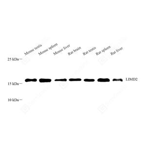 WB检测LIMD2蛋白(货号 GB114897). 样品: 经RIPA裂解液(货号G2002)处理的蛋白质. 封闭: 封闭: 3%脱脂牛奶(货号GC310001)溶于TBST溶液, 室温孵育1小时. —抗: 1: 800稀释, 4℃ 孵育过夜. 二抗: HRP标记山羊抗兔IgG (H+L) (货号GB23303), 1: 5000稀释, 室温孵育1小时. |