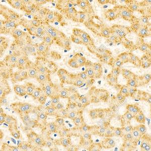 IHC检测MP68蛋白(货号 GB114431). 样品: 人肝, 4%多聚甲醛 (货号G1101) 固定12-24小时. 抗原修复: 柠檬酸抗原修复液(干粉, pH 6.0) (G1201), 高压锅均匀喷气计时2分钟. —抗: 1: 900稀释, 4℃ 孵育过夜. 二抗: HRP标记山羊抗兔IgG (H+L) (货号GB23303), 1: 200稀释, 室温孵育1小时. |