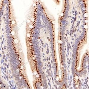 IHC检测PRAP1蛋白(货号 GB113137). 样品: 小鼠小肠, 4%多聚甲醛 (货号G1101) 固定12-24小时. 抗原修复: 柠檬酸抗原修复液(干粉, pH 6.0) (G1201), 98℃, 20分钟. —抗: 1: 4200稀释, 4℃ 孵育过夜. 二抗: HRP标记山羊抗兔IgG (H+L) (货号GB23303), 1: 200稀释, 室温孵育1小时. |