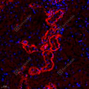 IF检测RhD蛋白(货号 GB112413)(红色). 样品: 小鼠肾, 4%多聚甲醛 (货号G1101) 固定12-24小时. 抗原修复: Tris-EDTA抗原修复液(pH 9.0) (G1203), 98℃, 20分钟. 封闭: 3% BSA(货号GC305010)的PBS溶液, 室温孵育30分钟. —抗: 1: 500稀释, 4℃ 孵育过夜. 二抗: Cy3标记山羊抗兔IgG (H+L) (货号GB21303), 1: 300稀释, 室温孵育1小时. |