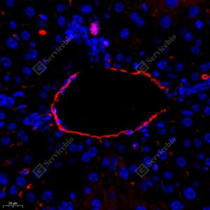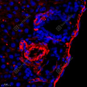 IF检测RhD蛋白(货号 GB112413)(红色). 样品: 小鼠肝, 4%多聚甲醛 (货号G1101) 固定12-24小时. 抗原修复: Tris-EDTA抗原修复液(pH 9.0) (G1203), 98℃, 20分钟. 封闭: 3% BSA(货号GC305010)的PBS溶液, 室温孵育30分钟. —抗: 1: 500稀释, 4℃ 孵育过夜. 二抗: Cy3标记山羊抗兔IgG (H+L) (货号GB21303), 1: 300稀释, 室温孵育1小时. |