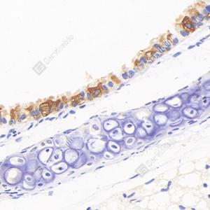 IHC检测RSPH4A蛋白(货号 GB114493). 样品: 小鼠气管, 4%多聚甲醛 (货号G1101) 固定12-24小时. 抗原修复: 柠檬酸抗原修复液(干粉, pH 6.0) (G1201), 98℃, 20分钟. —抗: 1: 1000稀释, 4℃ 孵育过夜. 二抗: HRP标记山羊抗兔IgG (H+L) (货号GB23303), 1: 200稀释, 室温孵育1小时. |