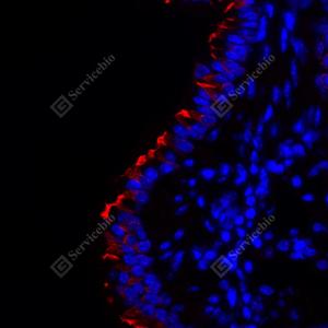 IF检测RSPH4A蛋白(货号 GB114493)(红色). 样品: 小鼠肺, 4%多聚甲醛 (货号G1101) 固定12-24小时. 抗原修复: Tris-EDTA抗原修复液(pH 9.0) (G1203), 98℃, 20分钟. 封闭: 3% BSA(货号GC305010)的PBS溶液, 室温孵育30分钟. —抗: 1: 500稀释, 4℃ 孵育过夜. 二抗: Cy3标记山羊抗兔IgG (H+L) (货号GB21303), 1: 300稀释, 室温孵育1小时. |