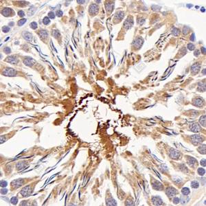 IHC检测SP17蛋白(货号 GB114763). 样品: 小鼠睾丸, 4%多聚甲醛 (货号G1101) 固定12-24小时. 抗原修复: 柠檬酸抗原修复液(干粉, pH 6.0) (G1201), 98℃, 20分钟. —抗: 1: 1500稀释, 4℃ 孵育过夜. 二抗: HRP标记山羊抗兔IgG (H+L) (货号GB23303), 1: 200稀释, 室温孵育1小时. |