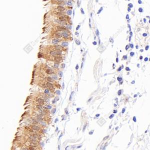 IHC检测SP17蛋白(货号 GB114763). 样品: 人肺, 4%多聚甲醛 (货号G1101) 固定12-24小时. 抗原修复: 柠檬酸抗原修复液(干粉, pH 6.0) (G1201), 98℃, 20分钟. —抗: 1: 1500稀释, 4℃ 孵育过夜. 二抗: HRP标记山羊抗兔IgG (H+L) (货号GB23303), 1: 200稀释, 室温孵育1小时. |