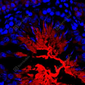 IF检测SP17蛋白(货号 GB114763)(红色). 样品: 大鼠睾丸, 4%多聚甲醛 (货号G1101) 固定12-24小时. 抗原修复: Tris-EDTA抗原修复液(pH 9.0) (G1203), 98℃, 20分钟. 封闭: 3% BSA(货号GC305010)的PBS溶液, 室温孵育30分钟. —抗: 1: 1500稀释, 4℃ 孵育过夜. 二抗: Cy3标记山羊抗兔IgG (H+L) (货号GB21303), 1: 300稀释, 室温孵育1小时. |
