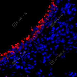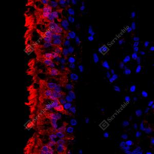 IF检测SP17蛋白(货号 GB114763)(红色). 样品: 小鼠肺, 4%多聚甲醛 (货号G1101) 固定12-24小时. 抗原修复: Tris-EDTA抗原修复液(pH 9.0) (G1203), 98℃, 20分钟. 封闭: 3% BSA(货号GC305010)的PBS溶液, 室温孵育30分钟. —抗: 1: 1500稀释, 4℃ 孵育过夜. 二抗: Cy3标记山羊抗兔IgG (H+L) (货号GB21303), 1: 300稀释, 室温孵育1小时. |