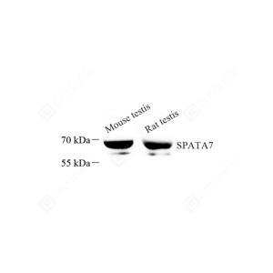 WB检测SPATA7蛋白(货号 GB115452). 样品: 经RIPA裂解液(货号G2002)处理的蛋白质. 封闭: 封闭: 3%脱脂牛奶(货号GC310001)溶于TBST溶液, 室温孵育1小时. —抗: 1: 1000稀释, 4℃ 孵育过夜. 二抗: HRP标记山羊抗兔IgG (H+L) (货号GB23303), 1: 5000稀释, 室温孵育1小时. |