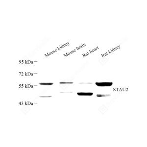 Staufen homolog 2 is a member of the family of double-stranded RNA (dsRNA)-binding proteins involved in the transport and/or localization of mRNAs to different subcellular compartments and/or organelles. These proteins are characterized by the presence of multiple dsRNA-binding domains which are required to bind RNAs having double-stranded secondary structures. Staufen homolog 2 shares 48. 5% and 59. 9% similarity with drosophila and human staufen, respectively.