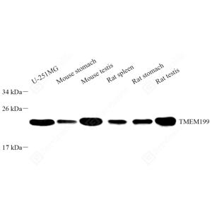TMEM199, also named as C17orf32, is a component of the complex sense antisense architecture (CSAGA).Accessory component of the proton-transporting vacuolar (V)-ATPase protein pump involved in intracellular iron homeostasis. In aerobic conditions, required for intracellular iron homeostasis, thus triggering the activity of Fe2+ prolyl hydroxylase (PHD) enzymes, and leading to HIF1A hydroxylation and subsequent proteasomal degradation. Necessary for endolysosomal acidification and lysosomal degradation . May be involved in Golgi homeostasis.