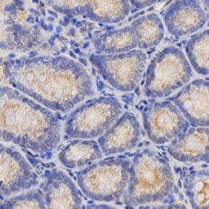 IHC检测TMEM177蛋白(货号 GB113343). 样品: 小鼠结肠, 4%多聚甲醛 (货号G1101) 固定12-24小时. 抗原修复: 柠檬酸抗原修复液(干粉, pH 6.0) (G1201), 98℃, 20分钟. —抗: 1: 900稀释, 4℃ 孵育过夜. 二抗: HRP标记山羊抗兔IgG (H+L) (货号GB23303), 1: 200稀释, 室温孵育1小时. |