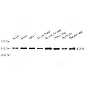 WB检测TTC35蛋白(货号 GB112645). 样品: 经RIPA裂解液(货号G2002)处理的蛋白质. 封闭: 封闭: 3%脱脂牛奶(货号GC310001)溶于TBST溶液, 室温孵育1小时. —抗: 1: 1000稀释, 4℃ 孵育过夜. 二抗: HRP标记山羊抗兔IgG (H+L) (货号GB23303), 1: 5000稀释, 室温孵育1小时. |
