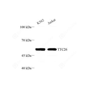 WB检测TTC26蛋白(货号 GB115647). 样品: 经RIPA裂解液(货号G2002)处理的蛋白质. 封闭: 3%脱脂牛奶(货号GC310001)溶于TBST溶液, 室温孵育1小时. —抗: 1: 500稀释, 4℃ 孵育过夜. 二抗: HRP标记山羊抗兔IgG (H+L) (货号GB23303), 1: 5000稀释, 室温孵育1小时. |