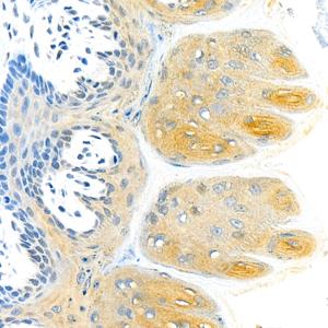 IHC检测VSIG8蛋白(货号 GB114414). 样品: 小鼠舌头, 4%多聚甲醛 (货号G1101) 固定12-24小时. 抗原修复: 柠檬酸抗原修复液(干粉, pH 6.0) (G1201), 98℃, 20分钟. —抗: 1: 2000稀释, 4℃ 孵育过夜. 二抗: HRP标记山羊抗兔IgG (H+L) (货号GB23303), 1: 200稀释, 室温孵育1小时. |