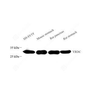 WB检测YRDC蛋白(货号 GB115259). 样品: 经RIPA裂解液(货号G2002)处理的蛋白质. 封闭: 封闭: 3%脱脂牛奶(货号GC310001)溶于TBST溶液, 室温孵育1小时. —抗: 1: 800稀释, 4℃ 孵育过夜. 二抗: HRP标记山羊抗兔IgG (H+L) (货号GB23303), 1: 5000稀释, 室温孵育1小时. |