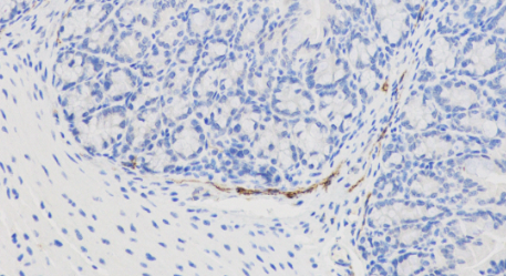 | Immunohistochemistry analysis of paraffin-embedded mouse colon using LYVE1 (GB11127) at dilution of 1:2000 |